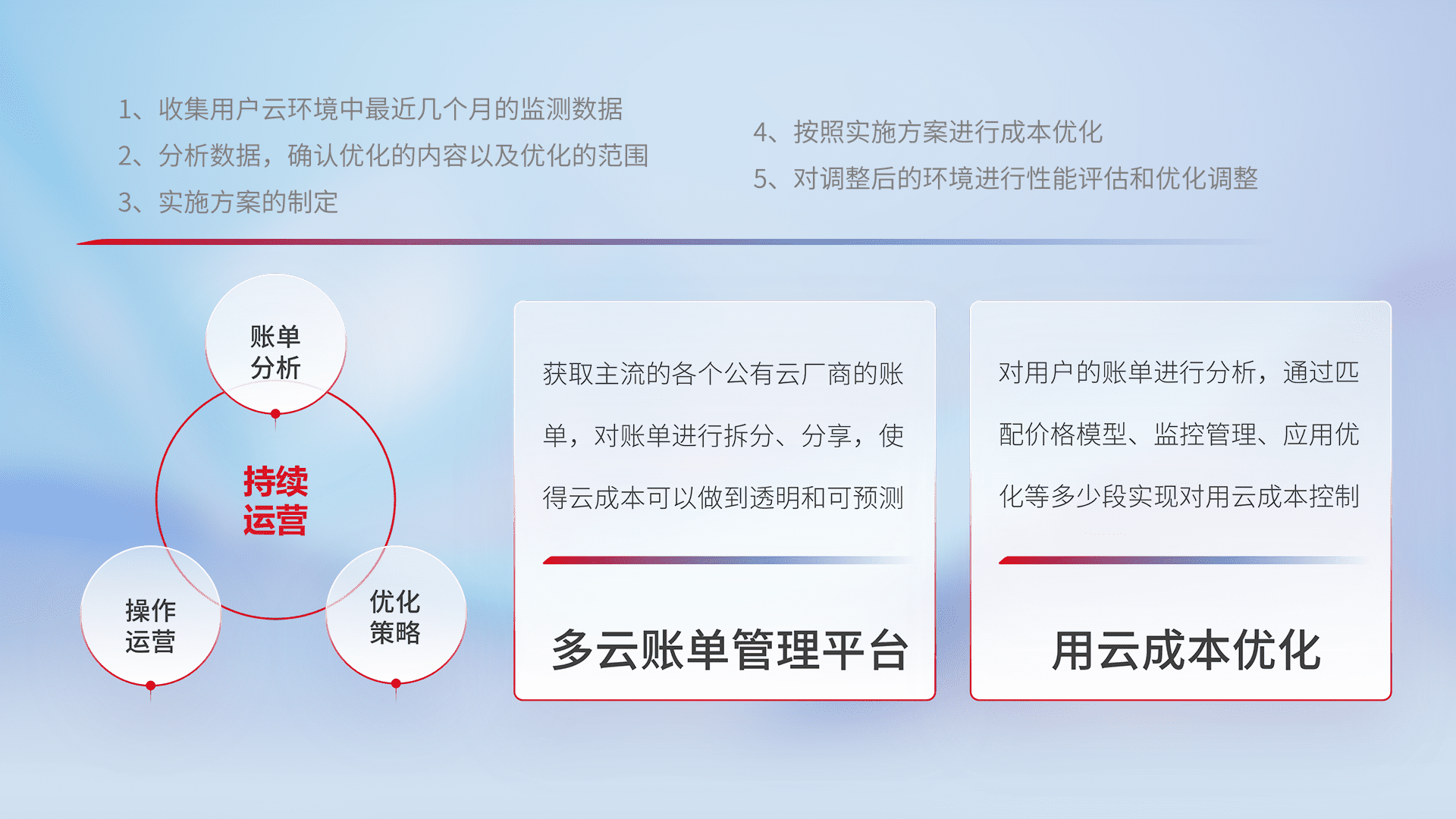 通过多云纳管,,以统一的资源数据模型把客户的云资源进行抽象和封装,,,进而实现对多云资源的统一操作,,,保障云资源管理的可靠性、、、稳定性与可用性。。。量身定制化运维内容,,配置、、、开发运维、、、补丁管理、、、、备份、、、、监控、、、、认证和访问管理、、、、审计和日常巡检等,,,保障在用云过程中的可靠度,,稳定度以及高可用率。。。。