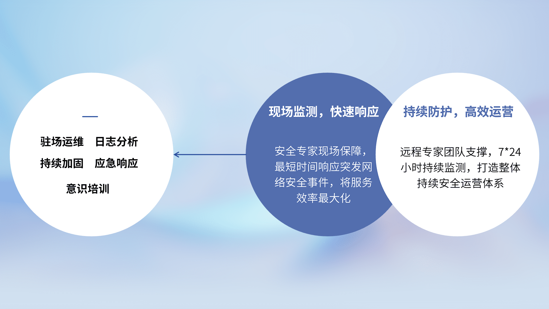 7X24小时持续监测安全事件,保持安全策略有效性,降低资产脆弱性风险,,精准拦截黑客攻击,,,减少被黑客利用的机会,,,,第一时间遏制,,,,降低损失。。